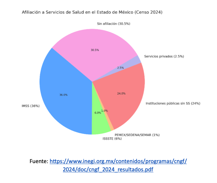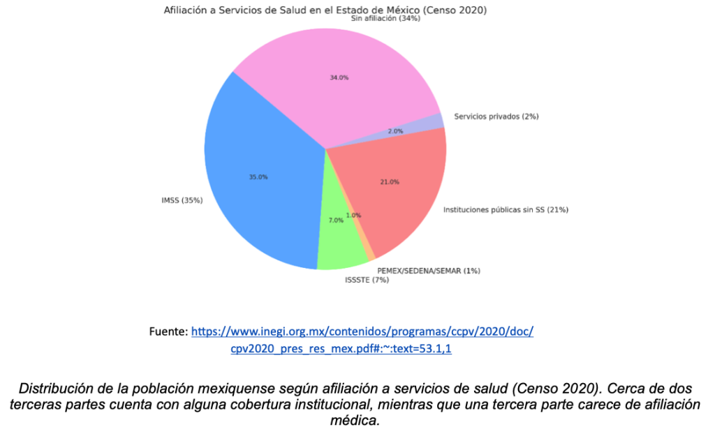 En el Estado de México, la realidad de la cobertura sanitaria refleja grandes retos. De acuerdo con el Censo de Población y Vivienda 2020, alrededor de 5.67 millones de mexiquenses (una tercera parte de la población estatal) no estaban afiliados a ninguna institución de salud, lo que significa que carecían de protección financiera para sus gastos médicos. En contraste, unos 11.27 millones de habitantes sí contaban con acceso a servicios de salud a través de alguna institución pública, principalmente mediante el Seguro Social (IMSS) y los servicios estatales/federales para población sin seguridad social (antes INSABI, ahora IMSS-Bienestar). Este panorama indica que, pese a los esfuerzos, una proporción considerable de la población mexiquense depende de los servicios públicos abiertos (y en algunos casos de la atención privada de bajo costo) para cubrir sus necesidades de salud, evidenciando la importancia crítica de avanzar hacia la cobertura universal en la entidad (1).
