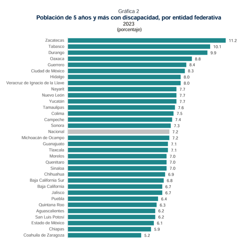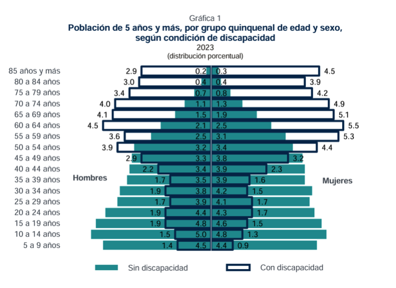 En México y con datos de la Encuesta Nacional sobre la Discapacidad e Invalidez 2023, se tienen identificados 7.1 millones (5.8% de la población) con alguna discapacidad en personas de 5 años de edad o más; los tipos más comunes de discapacidad son la Discapacidad Visual con 2.3 millones de personas, 1.8 millones de personas con Discapacidad Motora, 1.2 millones de personas con Discapacidad Auditiva; del total, solo el 45% de las personas con discapacidad tienen afiliación a servicios de salud pública.