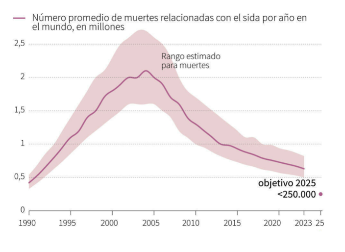 El VIH, que continúa siendo uno problemas para la salud pública mundial, ha cobrado más de 44.1 millones de vidas; se calcula que a finales de 2024 había 40.8 millones de personas infectadas por este virus, el 65% en la Región de África de la Organización Mundial de la Salud. En 2024 fallecieron alrededor de 630,000 personas por causas relacionadas con el VIH y 1.3 millones contrajeron el virus; aunque la infección por el VIH no tiene cura, el acceso creciente a la prevención, el diagnóstico, el tratamiento y la atención eficaces tanto de esta infección como de las infecciones oportunistas la ha convertido en un problema de salud que, a pesar de ser crónico, se puede tratar para poder llevar una vida larga y saludable. En 2025, el 95% de las personas con VIH deberían estar diagnosticadas, el 95% de ellas deberían estar tomando un tratamiento antirretrovírico (TAR) que les salve la vida y el 95% de los casos tratados deberán tener suprimida la carga vírica, tanto en beneficio de su salud como para reducir la transmisión del virus; en 2024, estos porcentajes fueron del 87%, el 89% y el 94%, respectivamente. En 2024, de todas las personas con VIH, el 87% conocía su estado, el 77% recibía tratamiento antirretrovírico y el 73% tenía la carga vírica suprimida.