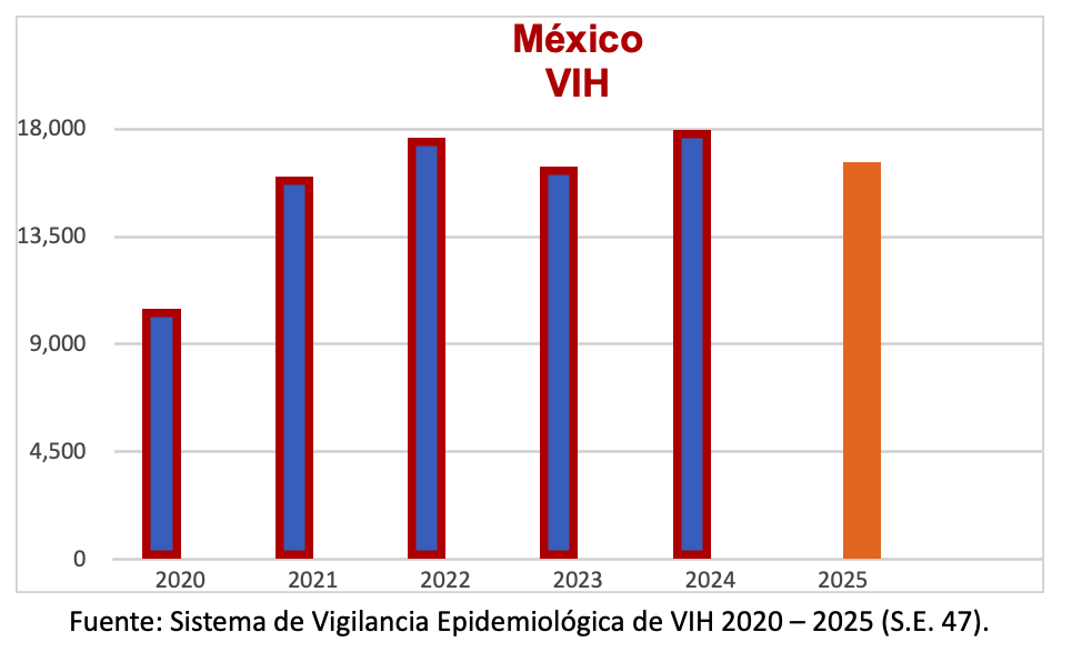 El Sistema de Vigilancia Epidemiológica de VIH, indica que los Casos de VIH en México, según el año de diagnóstico, en el año 2020 a nivel nacional hubo 10,464, para el año 2021 fueron 15,999, en el año 2022 fueron 17,620, en el año 2023 fueron 16,411 y en el 2024 de forma preliminar se tienen 17,953 casos registrados; a la Semana Epidemiológica No. 47 del 2025 (Del 16 al 22 de noviembre del 2025), se tienen registrados 16,630 casos nuevos, lo que demuestra una tendencia de incremento.