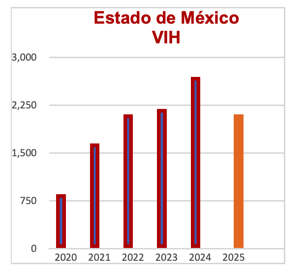 El Sistema de Vigilancia Epidemiológica de VIH, indica que los Casos de VIH en México, según el año de diagnóstico, en el año 2020 a nivel nacional hubo 856, para el año 2021 fueron 1,654, en el año 2022 fueron 2,110, en el año 2023 fueron 2,191 y en el 2024 de forma preliminar se tienen 2,696 casos registrados; a la Semana Epidemiológica No. 47 del 2025 (Del 16 al 22 de noviembre del 2025), se tienen registrados 2,107 casos nuevos, lo que demuestra una tendencia de incremento.